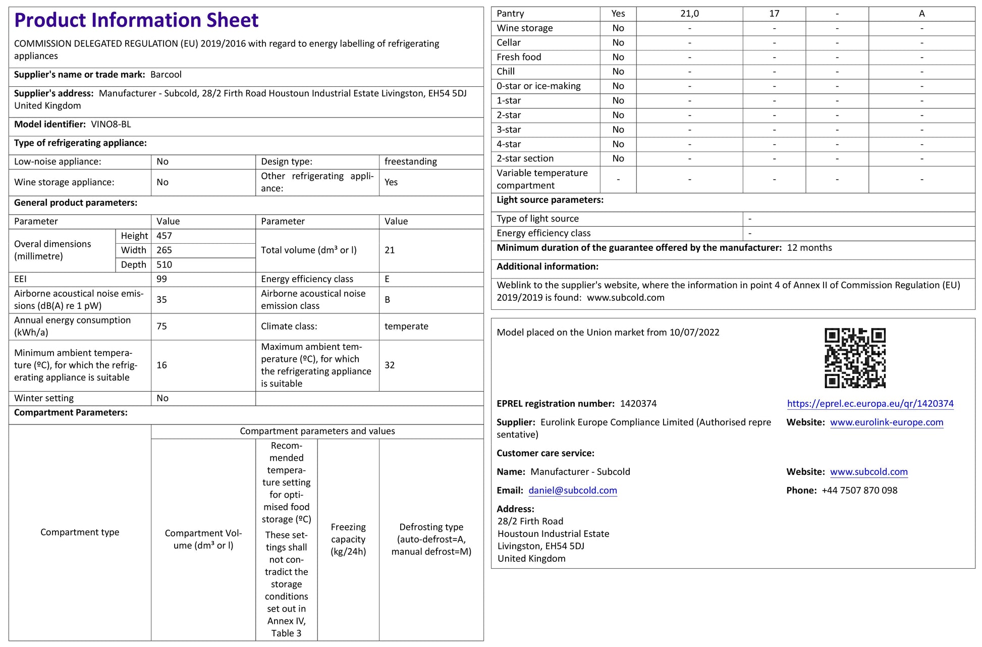 The Barcool Vino8 is equipped with advanced thermoelectric technology cooling for optimum performance. It is a very economical fridge with an impressive energy consumption of only 75 kWh/annum.