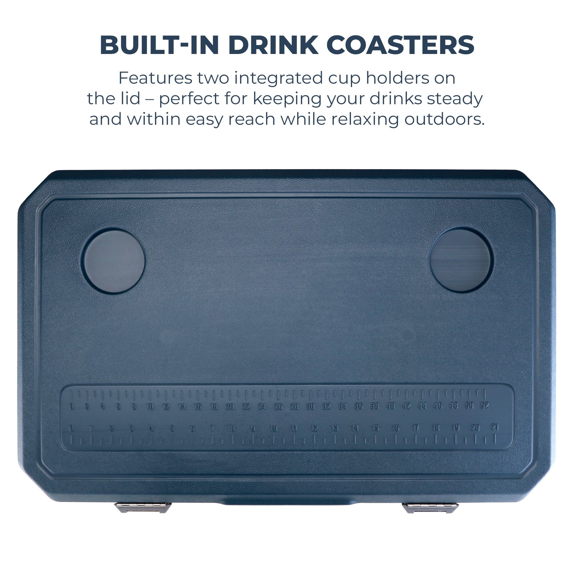 Built-in drink coasters on the lid provide a convenient spot to rest your cans or bottles, keeping your drinks upright and within easy reach.